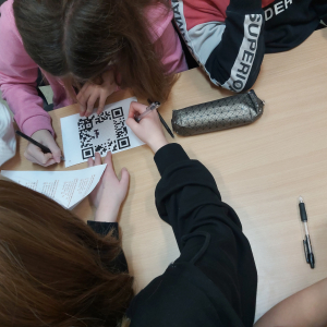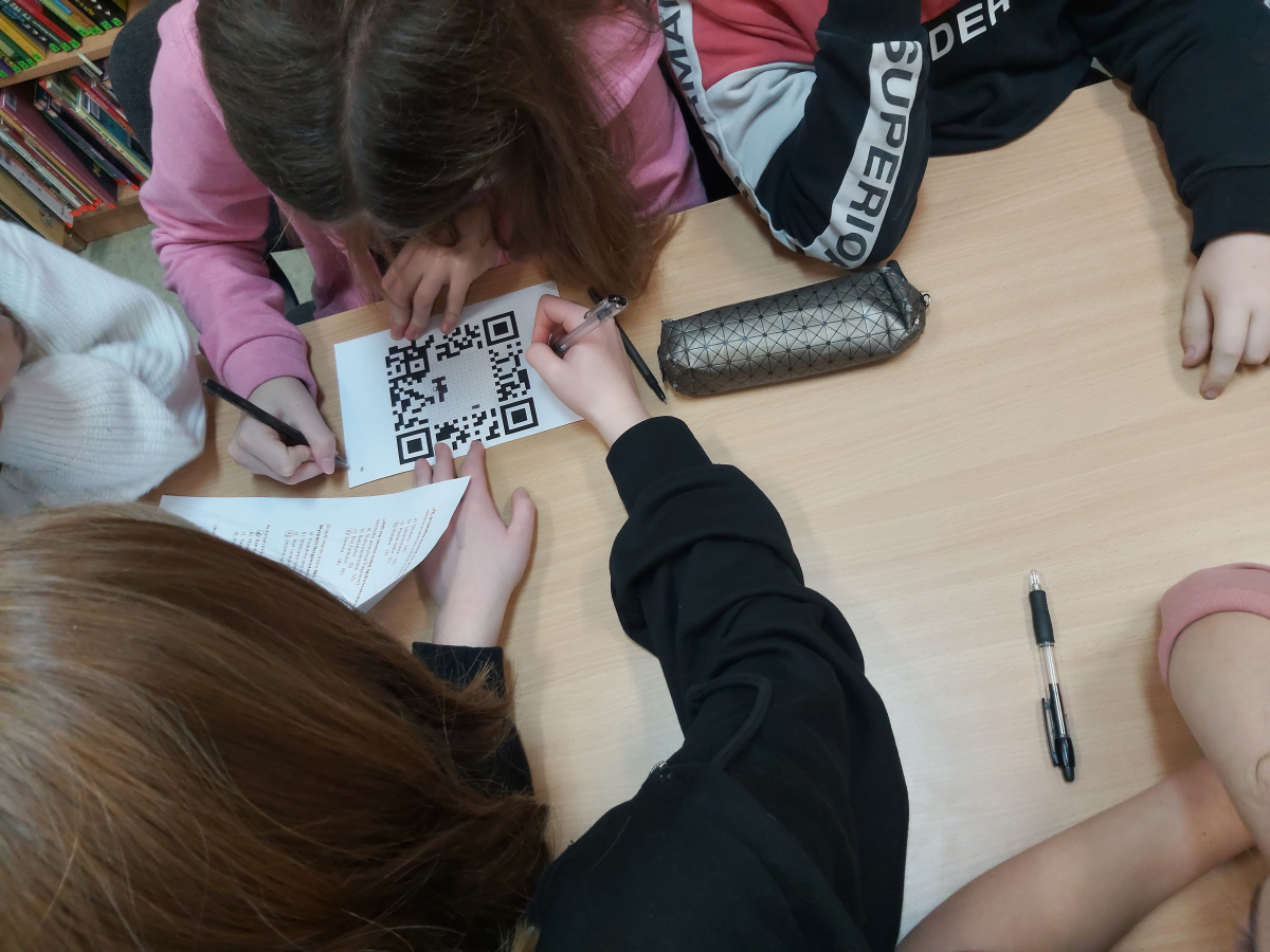 Młodzież podzielona na grupy rozwiązała test wiedzy. Prawidłowe odpowiedzi pozwoliły na uzupełnienie okienek w kodzie QR. Ten prawidłowo uzupełniony, po zeskanowaniu ujawniał nam hasło. Hasło brzmiało poezja – zatem sami widzicie, rozkodowaliśmy tą poezję!