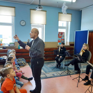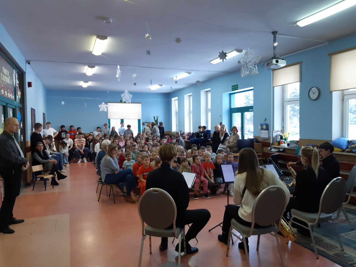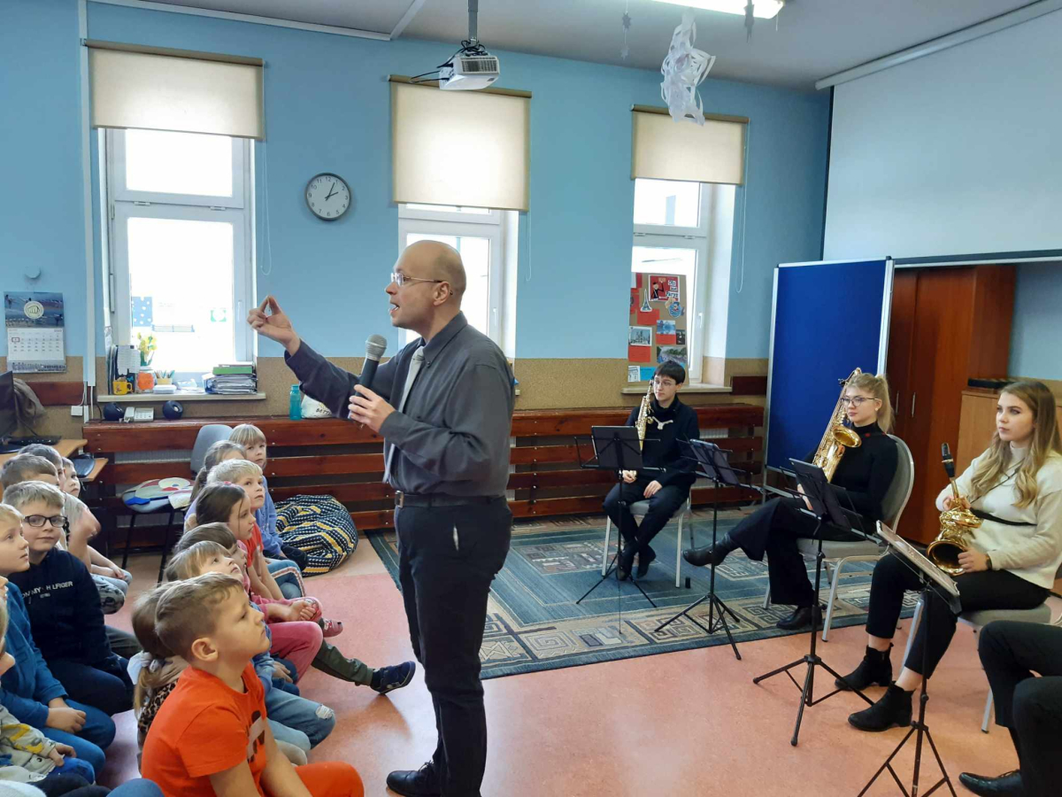 Podczas kolejnego, czwartego koncertu z Filharmonią Narodową zorganizowanego przez naszą bibliotekę 4 grudnia, razem z uczniami stojeckiej szkoły poznawaliśmy saksofon – jeden z najmłodszych instrumentów akustycznych.