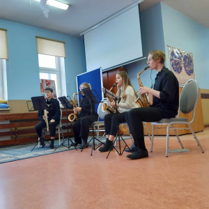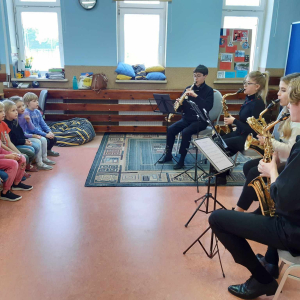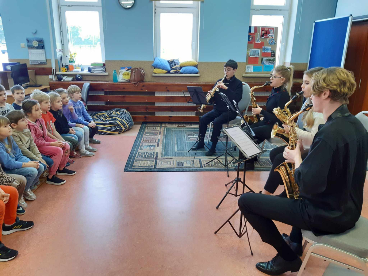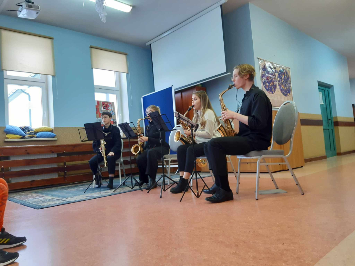 Saksofon nie znalazł miejsca w orkiestrze symfonicznej, ale jego zalety docenili kompozytorzy muzyki kameralnej, jazzowej oraz filmowej, co zaowocowało bogatą literaturą muzyczna. Na spotkaniu z kwartetem saksofonowym uczniowie wysłuchali wiele utworów, m.in.: temat z filmu „Różowa pantera”, z programu „The Muppet Show”, utwory musicalu „Girl Crazy”.