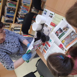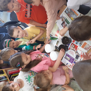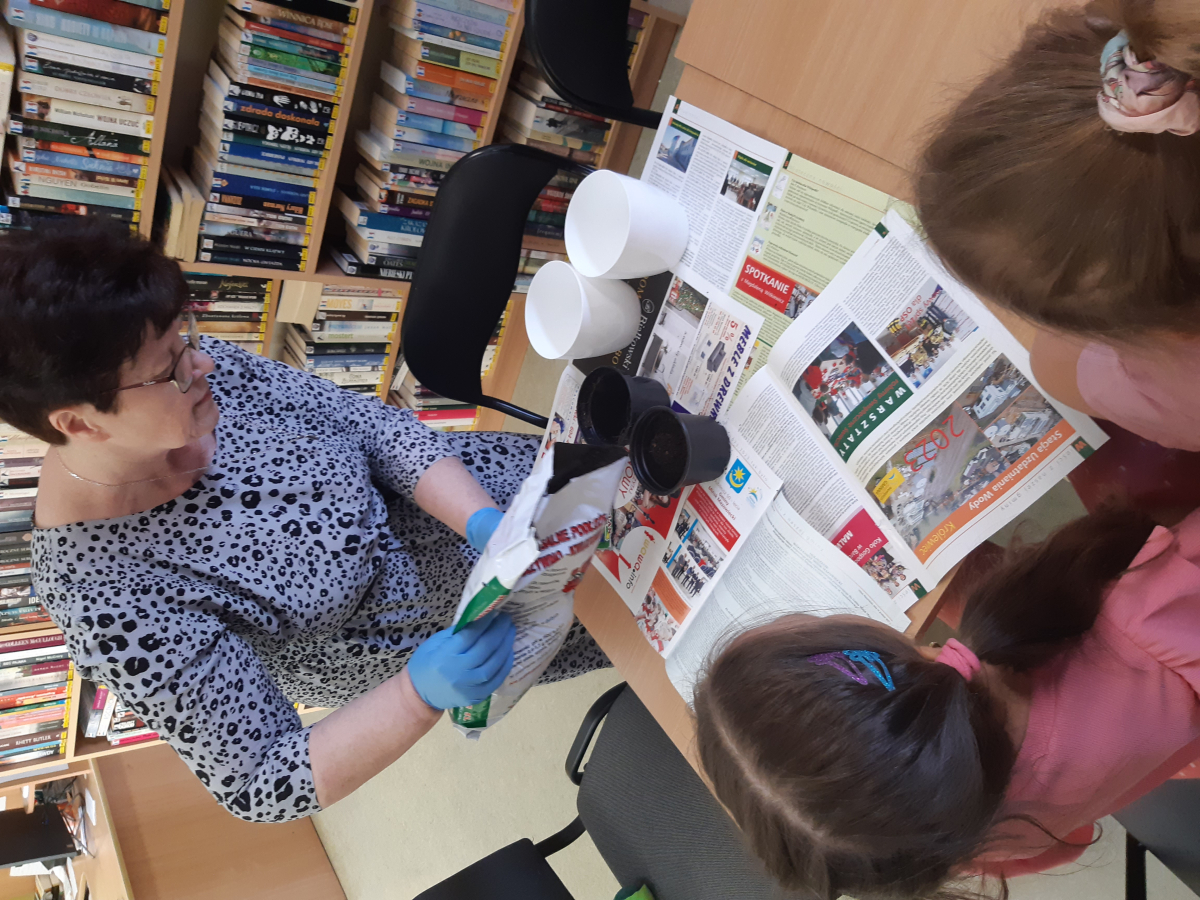 Pierwsza część spotkania dotyczyła tematyki czytelniczej, podczas której dzieci wysłuchały opowieści „Książki” (W bibliotece) autorstwa Christosa i z ilustracjami Lili Chemin. Była to niezwykła opowieść o młodym kociaku, który po raz pierwszy idzie z mamą do biblioteki, będąca wyprawą w świat wyobraźni.