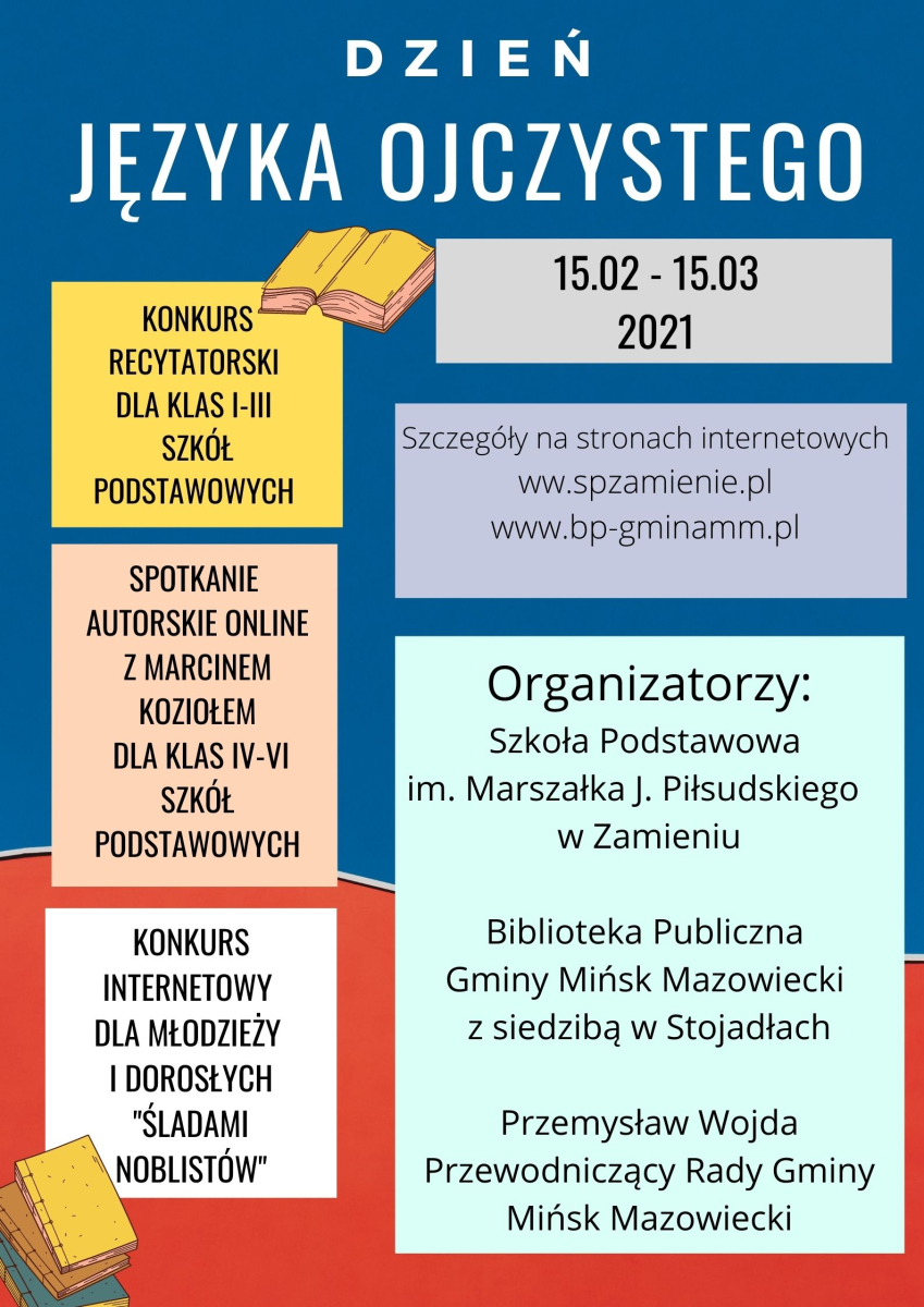 Biblioteka przy współpracy ze Szkołą Podstawową im. Marszałka Józefa Piłsudskiego w Zamieniu oraz p. Przemysławem Wojdą Przewodniczącym Rady Gminy Mińsk Mazowiecki zapraszają do wspólnego świętowania gminnych obchodów Dnia Języka Ojczystego. Dla najmłodszych uczniów klas I-III Szkół Podstawowych z terenu Gminy Mińsk Mazowiecki konkurs recytatorski, szczegółowe informacje w zakładce konkursy