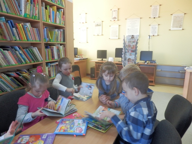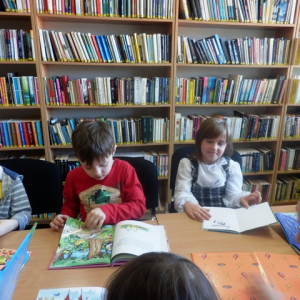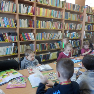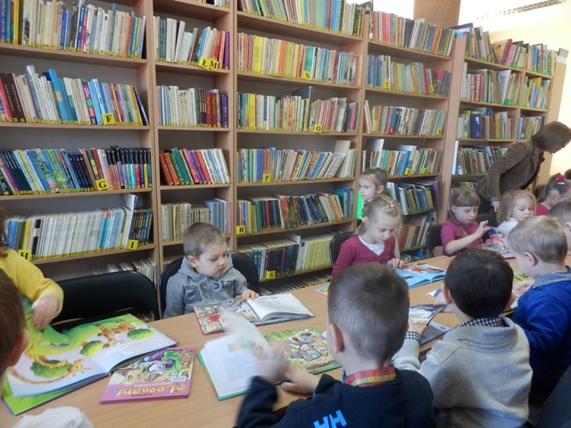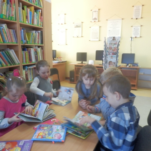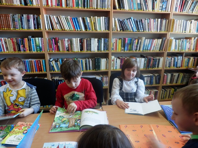 Uczniowie klasy “0” Szkoły Podstawowej w Stojadłach na lekcji bibliotecznej pt. Zanim książka trafi do biblioteki. 17 luty 2015 r.