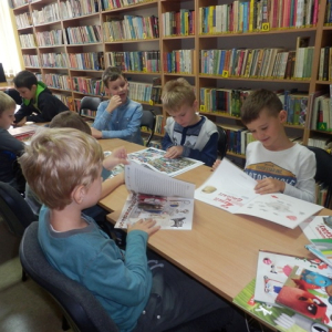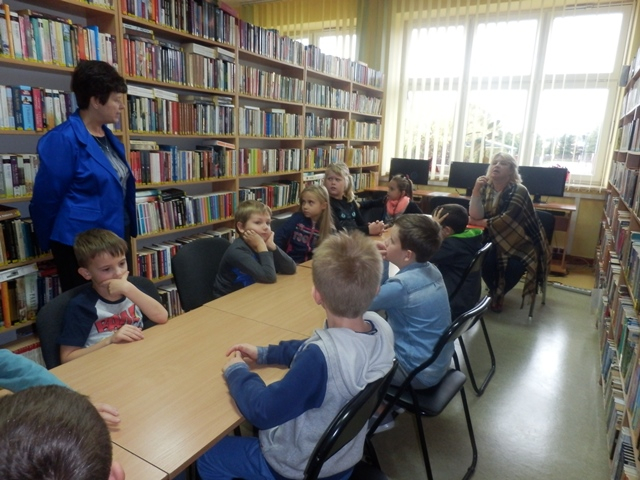 11 października 2016 r. Lekcja biblioteczna dla klasy II b ze Stojadeł. Uczniowie poznają zbiory i katalog biblioteczny.