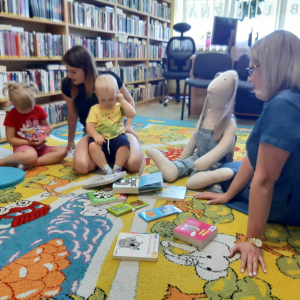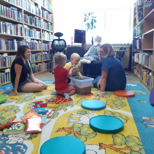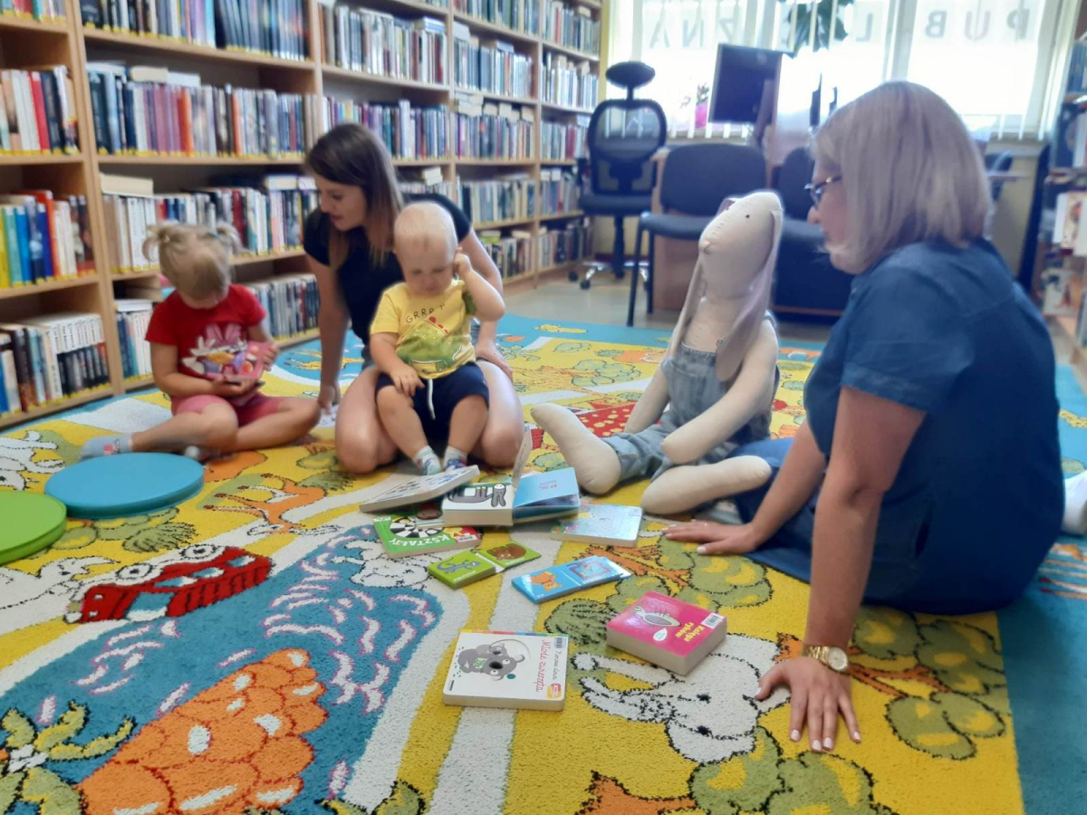 Po krótkim zapoznaniu, dzieci rozgościły się na dywanie i wspólnie z rodzicami oraz bibliotecznymi ciociami oglądały i czytały książeczki – zabawki, wierszyki i bajeczki.