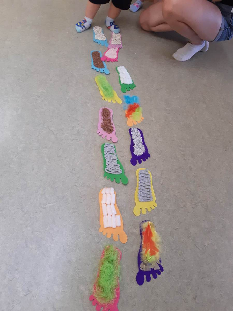 Budowaliśmy wspólnie wieże z miękkich, barwnych krążków, pojawiła się sensoryczna ścieżka, która gilgotała maluszki w stópki, było rzucanie do celu, segregowanie kolorów i szukanie skarbów w kaszy gryczanej.