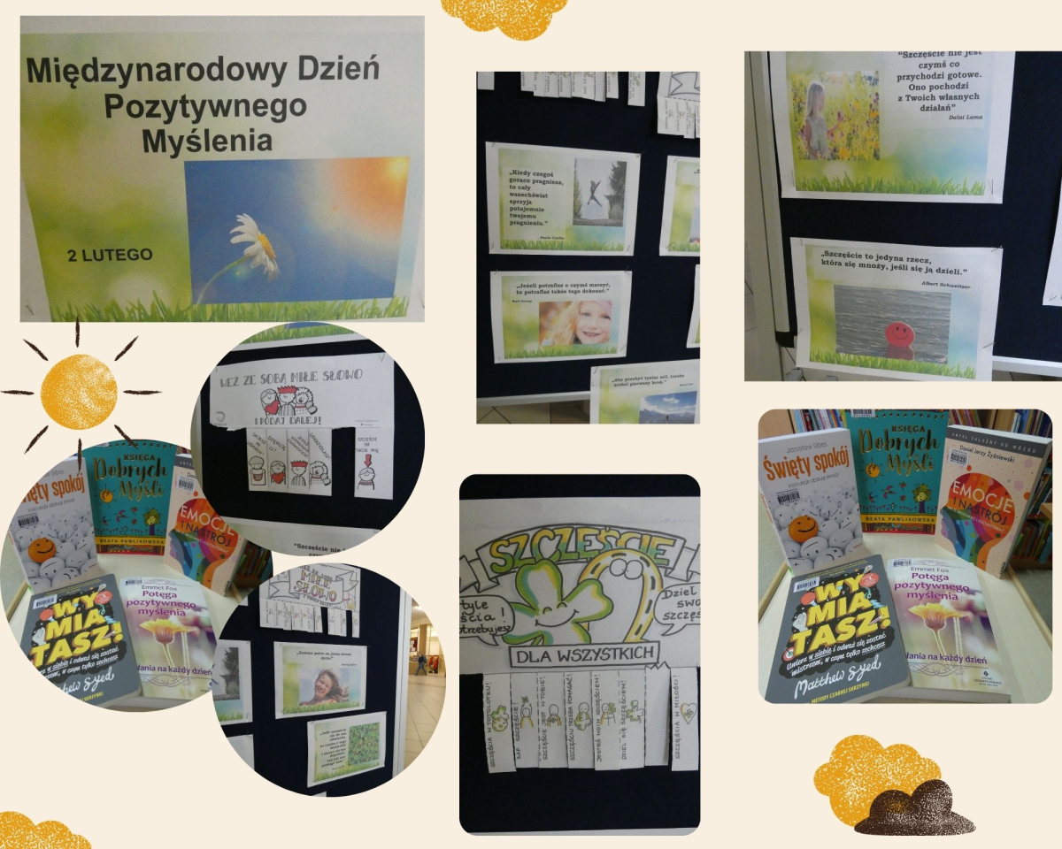 Emocje towarzyszą mam cały czas. Odczuwamy radość na widok nowej, długo wyczekiwanej książki, smutek, kiedy pozycja, którą wybraliśmy, została wypożyczona. Podekscytowanie, kiedy ktoś nam bliski polecił książkę i nie możemy się doczekać, aby zacząć czytać pozycję określoną jako „najlepsza, wybitna po prostu musisz to przeczytać!”. Ważne, aby te emocje były pozytywne, abyśmy patrzyli na świat optymistycznie. Pozytywne myślenie, według badań amerykańskiego psychologa Kirstena Harrella, wpływa na nasze zdrowie, zmniejsza o 10% ryzyko chorób serca, wylewów i depresji. Podobno na pozytywne myślenie nie ma recepty. Uważamy jednak, że książki dostępne w bibliotece są najlepszą receptą, zwłaszcza takie jak “Księga dobrych myśli” B. Pawlikowskiej czy “Potęga pozytywnego myślenia” E. Foxa. O dniu pozytywnego myślenia naszym czytelnikom przypomniały cytaty motywujące, ulotki i książki.