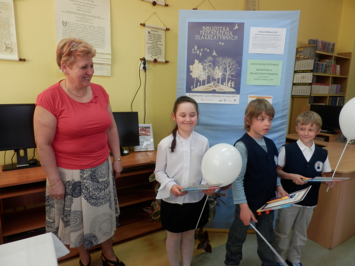 W dniu 10 maja 2013r. odbył się etap gminny XXX Edycji Konkursu Recytatorskiego dla dzieci im. Kornela Makuszyńskiego. W konkursie udział wzięło 14 uczniów ze szkół podstawowych gminy Mińsk Mazowiecki. Uczestnicy prezentowali po jednym wierszu oraz fragmencie prozy dowolnych autorów.