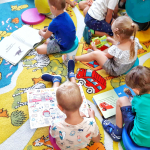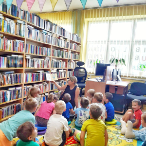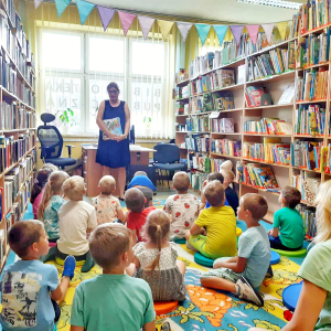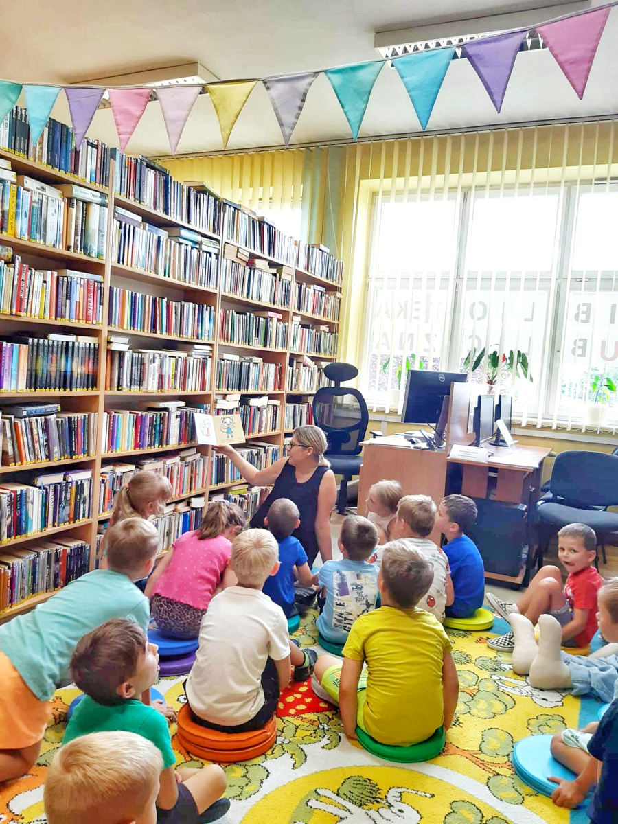 Dzisiaj gościliśmy dzieci z całej Gminy Mińsk Mazowiecki. Na najstarsze dzieci, które korzystają z opieki przedszkolnej w okresie wakacyjnym, czekała dzisiaj niespodzianka – wizyta w bibliotece. Już na samym wejściu dzieciaki powitał nasz Królik Franek. Następnie dzieci wysłuchały bajki o przygodach Królika i jego przyjaciół oraz historię o Kici Koci i jej wizycie w bibliotece. Później dzieci mogły same wybrać z półek książeczki. Nasi Mali Goście byli zachwyceni, bo każdy znalazł książkę w interesującym go temacie, z ulubionym bohaterem lub odkrył coś zupełnie nowego. Wszystkie dzieci wyraziły chęć i zainteresowanie dołączenia do grupy stałych czytelników, dlatego przekazałyśmy list do rodziców, w którym opisane są warunki i zasady zapisania się do Biblioteki. Dodatkowo dzieci w wieku 3-6 lat, które zapiszą się do Biblioteki, przyłączają się do projektu „Mała książka – Wielki człowiek”. Fantastyczna akcja, dzięki której dzieci rozwijają swoje zainteresowanie książkami i czytaniem. Przystępując do programu, dzieci otrzymują książeczkę w prezencie, w zestawie jest również publikacja dla rodziców, dodatkowo zakładka do książki oraz karta członkowska, na którą dzieci wklejają naklejki. Wszystkie szczegółowe informacje możecie Państwo uzyskać na miejscu w Bibliotece lub telefonicznie. Trudno było zakończyć tą fascynującą przygodę jaką okazała się wizyta w bibliotece. Na zakończenie dzieci dostały pakiety z elementami do samodzielnego wykonania zakładki do książki z wizerunkiem naszego Bibliotecznego Królika Franka.